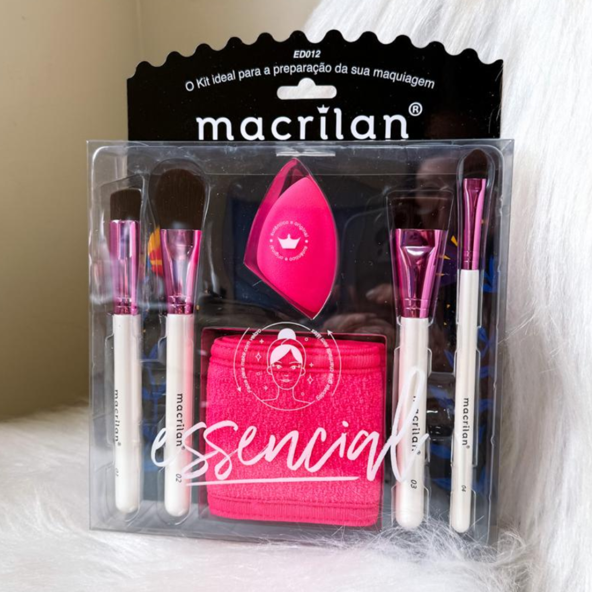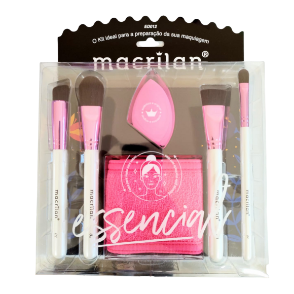 Kit ED012 Essencial da Macrilan, foi especialmente desenvolvido com 04 pincéis de cerdas sintéticas, 1 faixa de cabelo e 1 esponja super macia, sem látex, em formato de gota chanfrada. Os pincéis possuem cerdas e formatos que permitem um acabamento suave e impecável, além do cabo moderno e de fácil manuseio. O Kit essencial para a preparação da sua maquiagem.