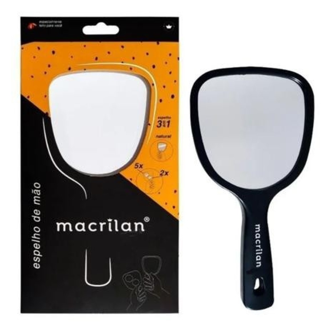 Espelho Triplo de Mão da Macrilan ES-02 especialmente desenvolvido com 3 espelhos, um com visualização natural, um com aumento 2x e um com aumento 5x, indicado para visualização do rosto e da pele com maior facilidade e praticidade.