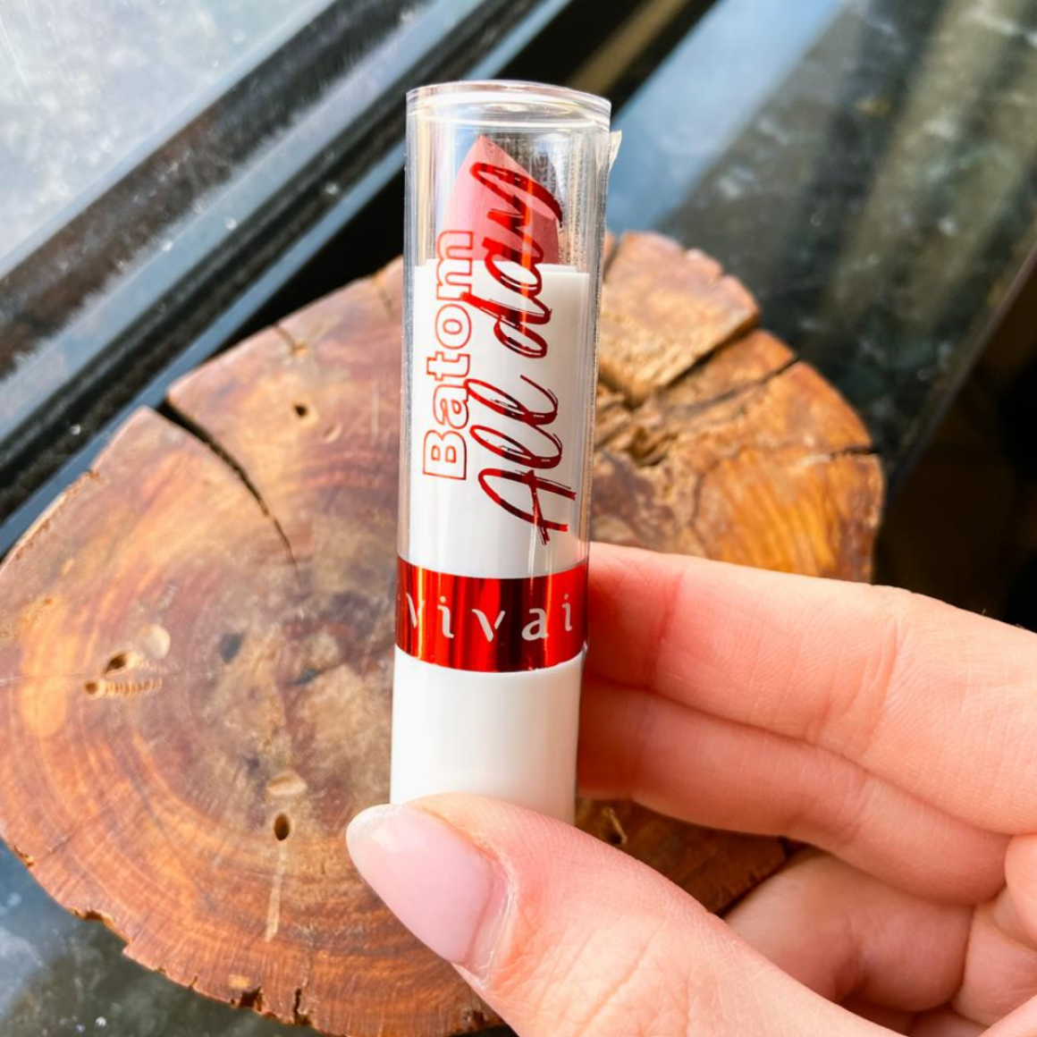 O batom bastão matte All Day da Vivai é um batom de acabamento matte com longa duração. Mantém a cor intensa e uniforme por horas sem borrar ou desbotar. textura macia e cremosa que se aplica facilmente e não resseca os lábios.