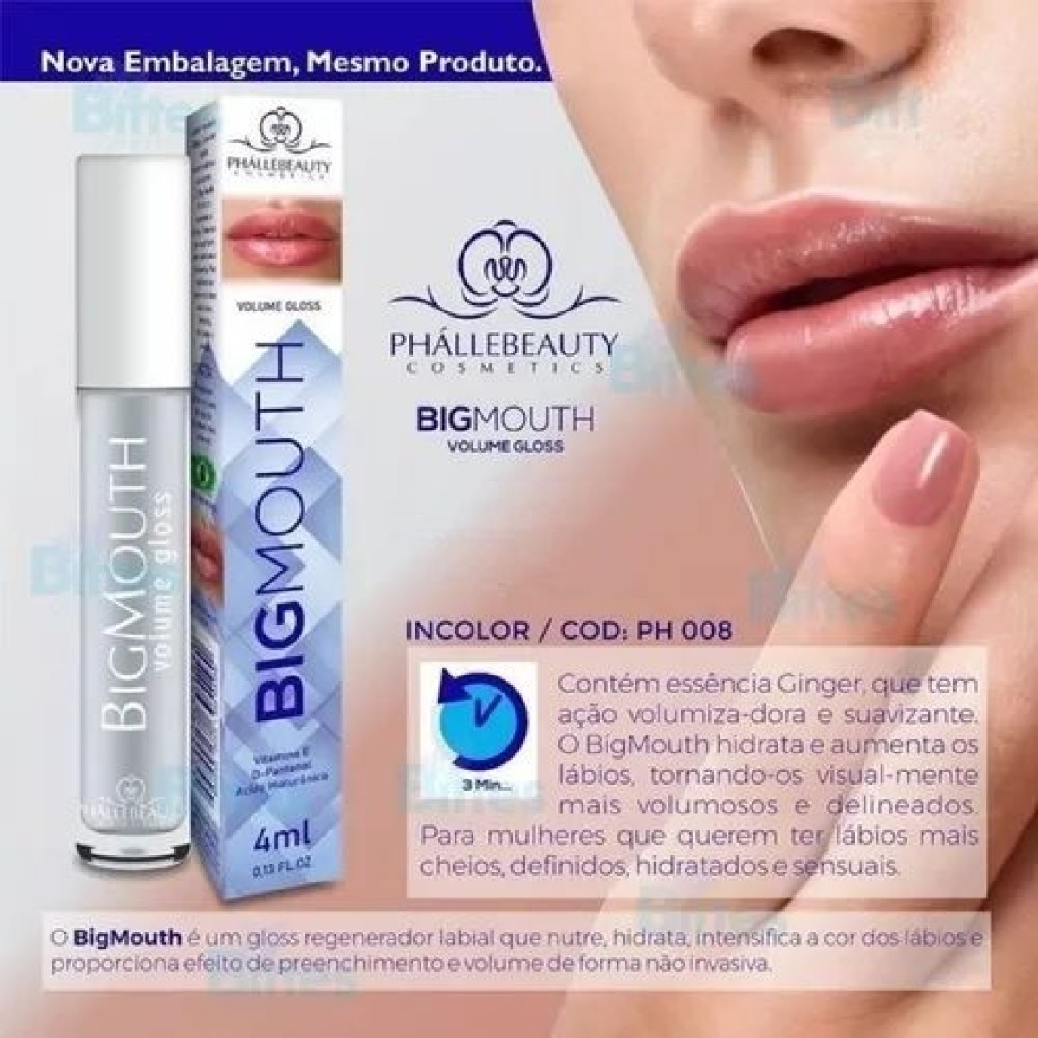 O Gloss Labial BigMouth da Phalle Beauty é um gloss regenerador labial que nutre, hidrata, intensifica a cor dos lábios e proporciona efeito de preenchimento e volumede forma não invasiva.