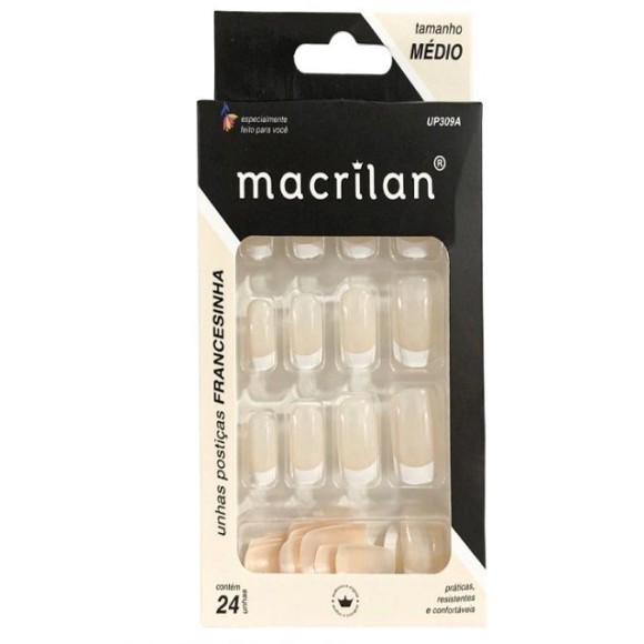 Unhas postiças UP309A tamanho médio Macrilan cor Francesinha, especialmente desenvolvidas em uma versão colorida para uma aplicação rápida e segura. Indicadas para uso pessoal e profissional.