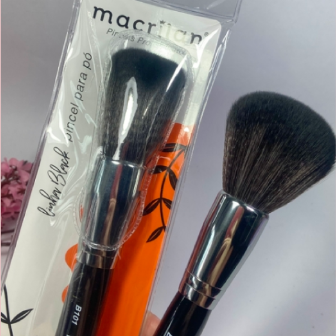 Pincel Macrilan B101, especialmente desenvolvido para aplicação de pó mineral, pó facial compacto, solto ou iluminador por toda a face e corpo. Feito com cerdas arredondadas e macias para uma aplicação suave e uma maquiagem uniforme.