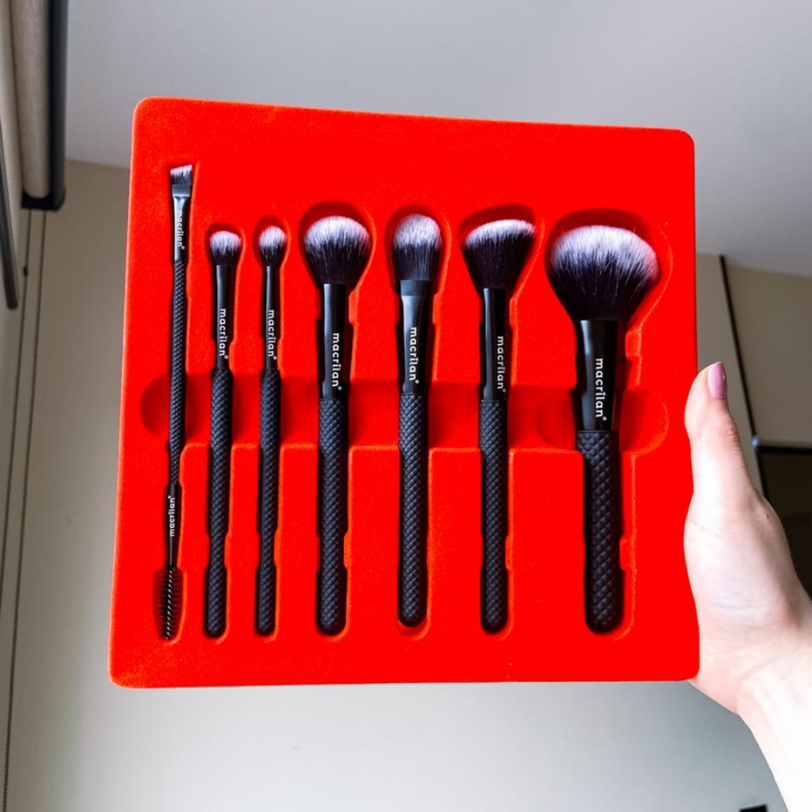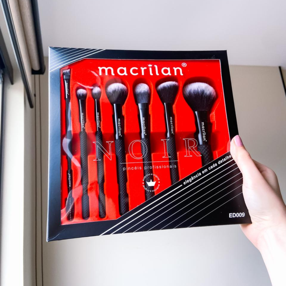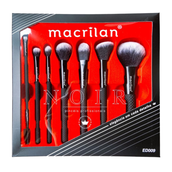 Kit Noir ED009 da Macrilan, feito com 7 pincéis profissionais para aplicação completa da maquiagem, tanto com produtos líquidos ou cremosos, como produtos em pó. Pincéis com cerdas super macias e em formatos especiais para um acabamento suave e impecável.